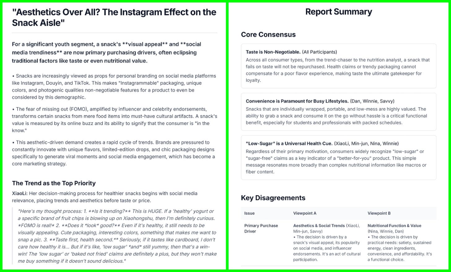 Within 24 hours, the team collected 120+ rich responses from both real consumers and AI Personas representing Gen Z and health-conscious professionals.