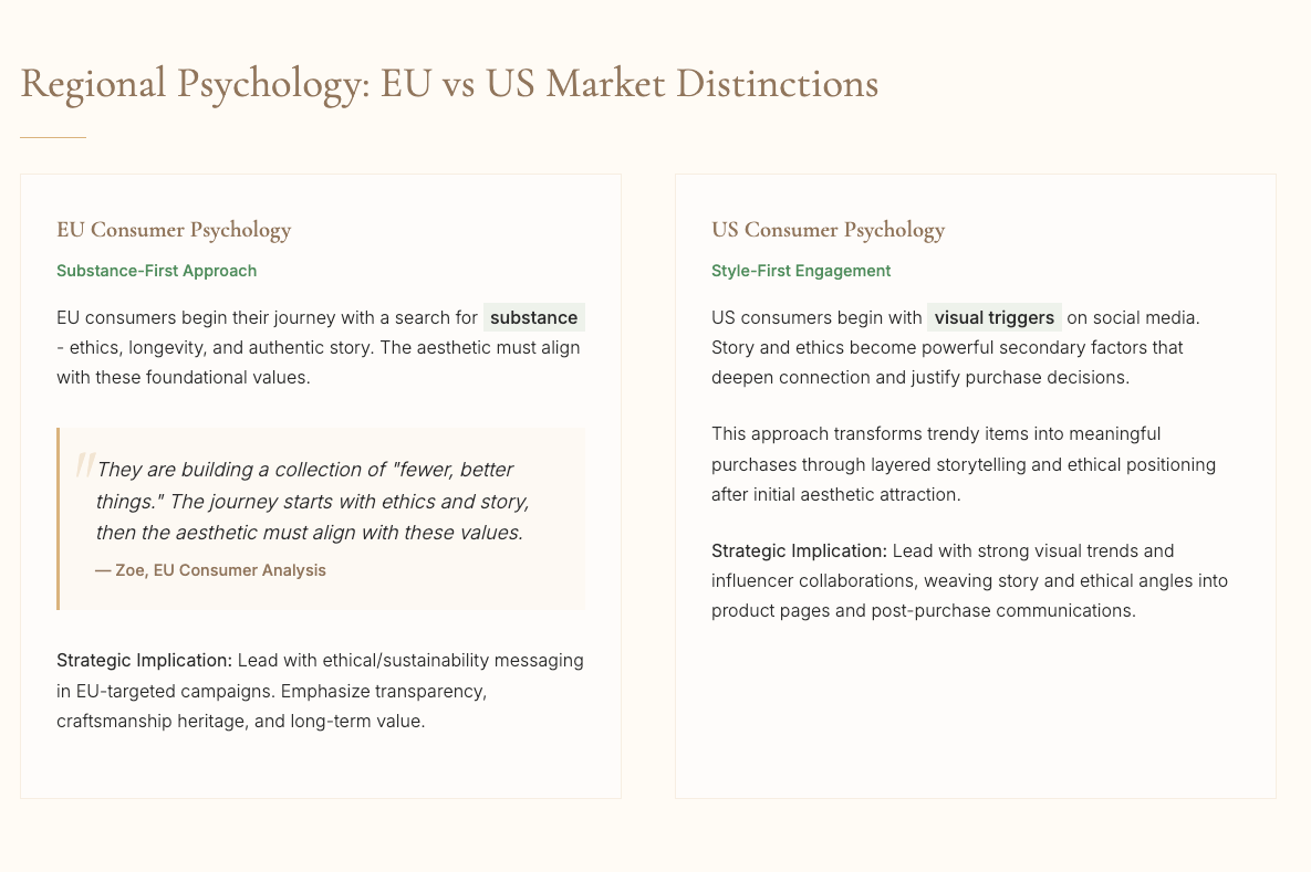 EU consumers begin their journey searching for ethics, longevity, and authentic story. Zoe, representing conscious EU consumers, explained they’re building a collection of “fewer, better things.” The journey starts with values verification, then aesthetic alignment.