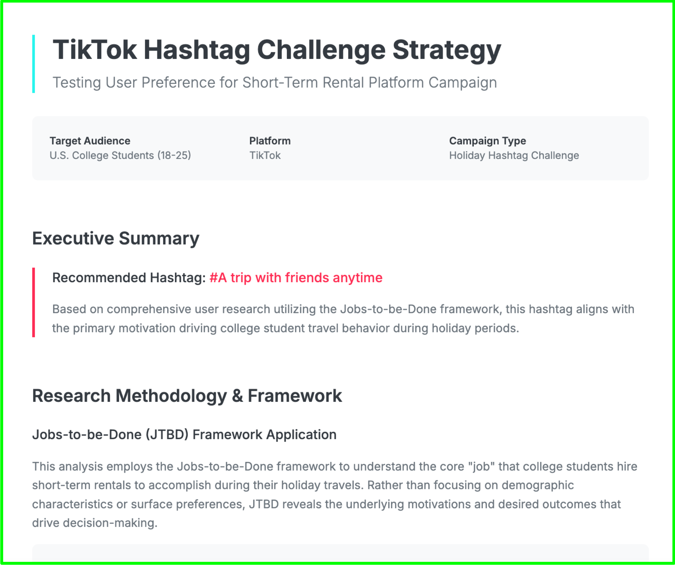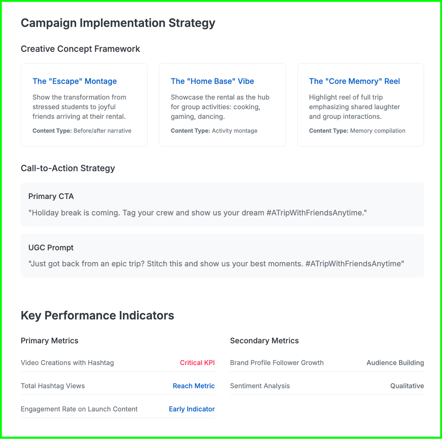 The team gained not only the right hashtag but also creator-ready content angles and a clear KPI plan for brand awareness and more user-created content for marketing.