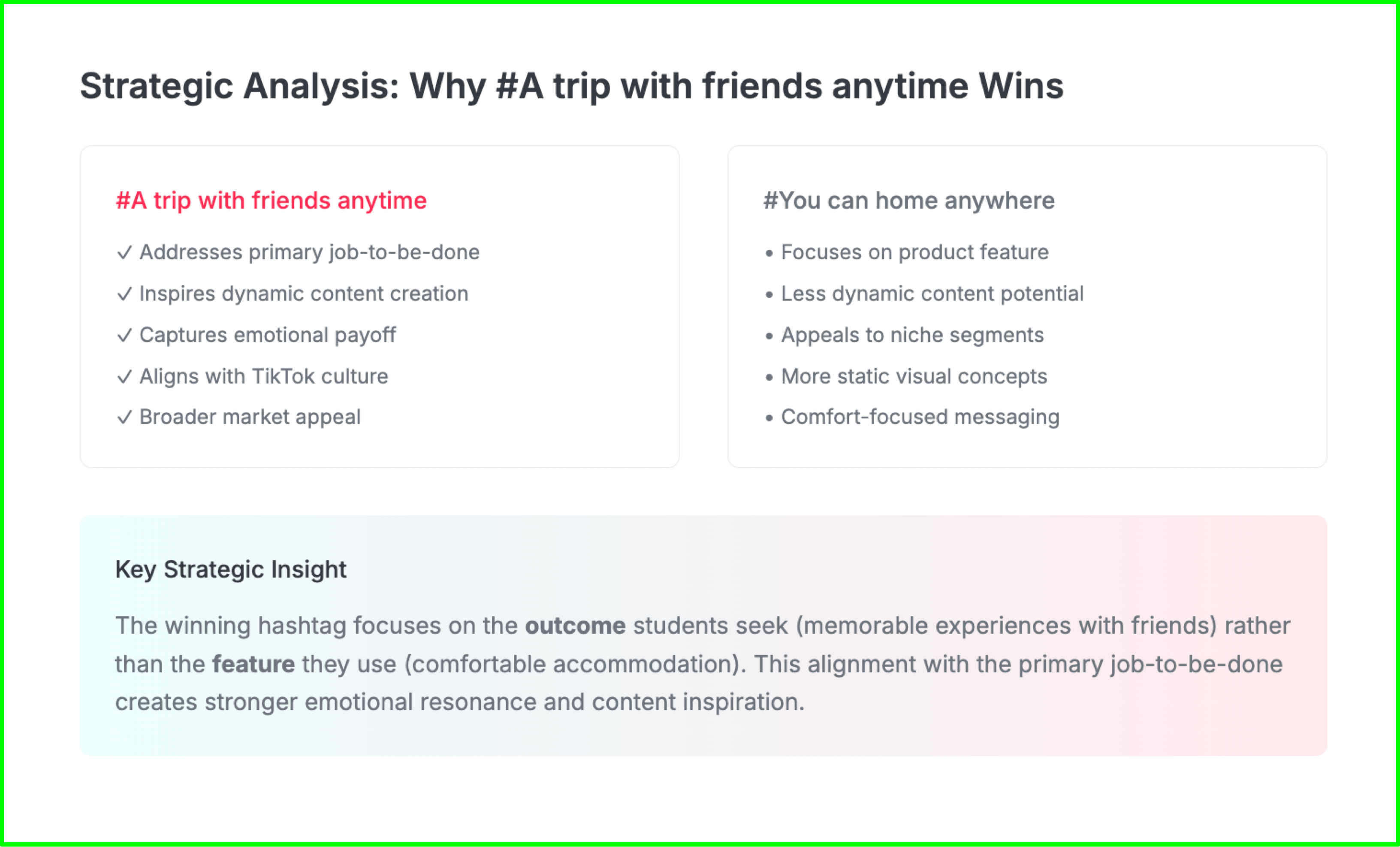 The team planned a TikTok hashtag challenge targeting U.S. college students for the holiday travel season. They needed to decide between two hashtags: #YouCanHomeAnywhere vs. #ATripWithFriendsAnytime to boost awareness and encourage user-generated travel content.