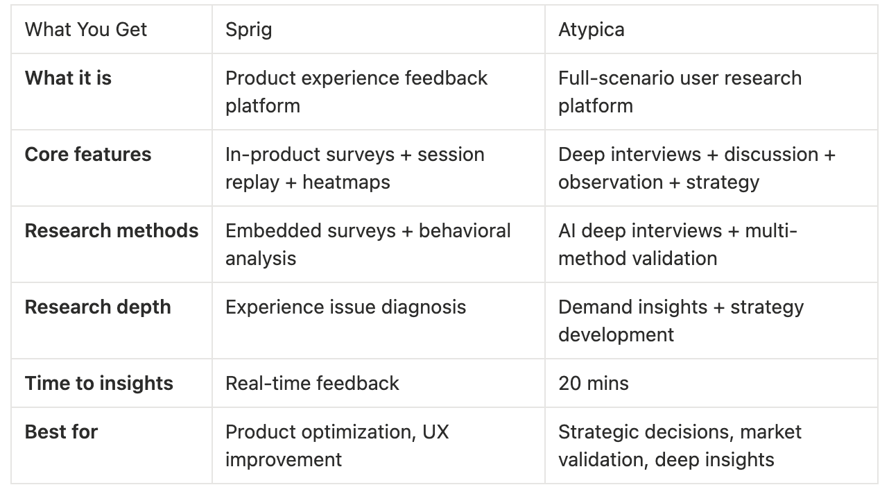 Sprig monitors “where the product isn’t working well” (experience optimization). Atypica reveals “why users need the product and what strategy to build” (strategic decisions).