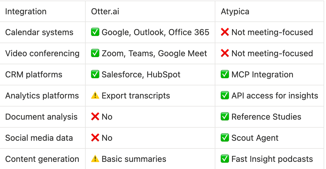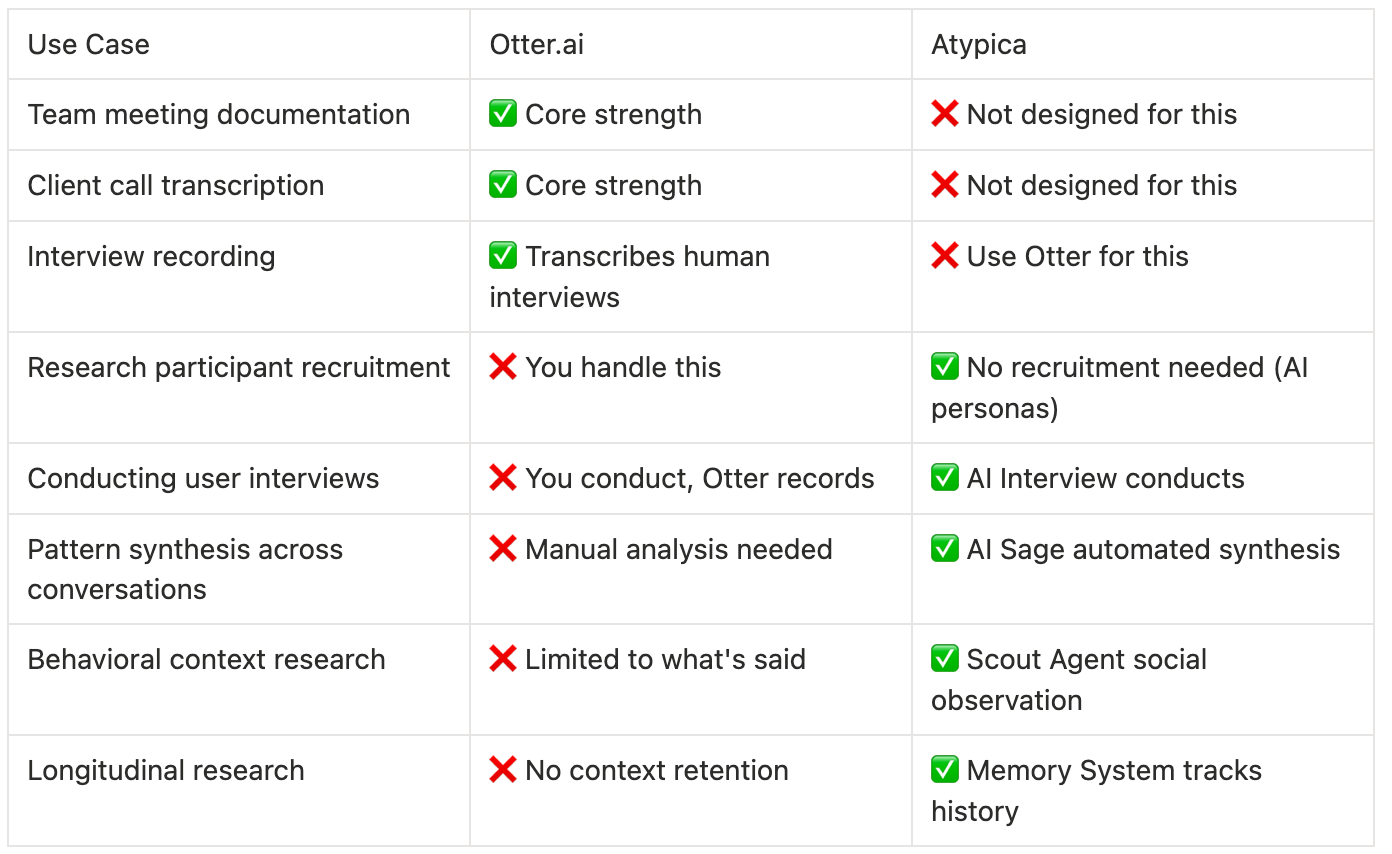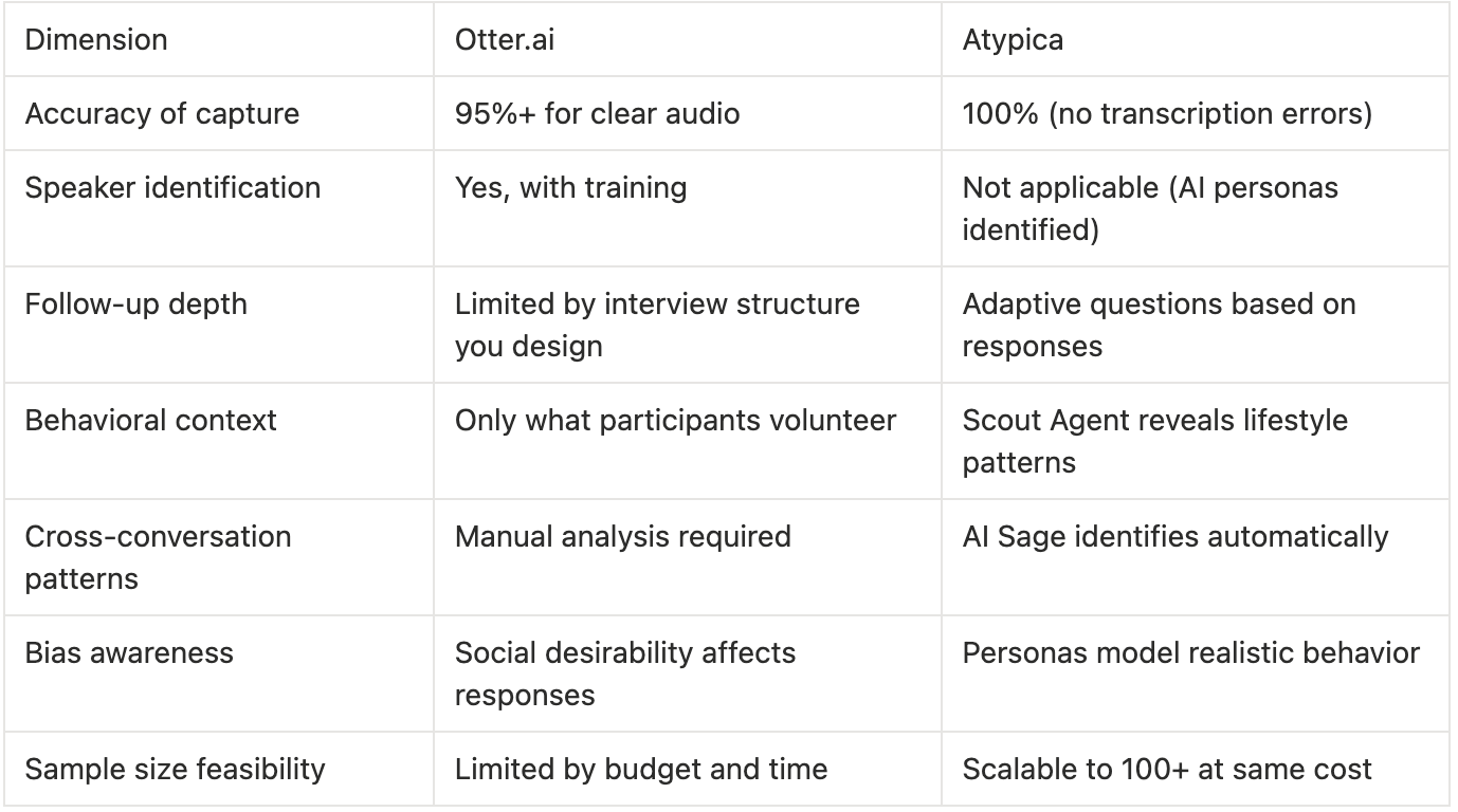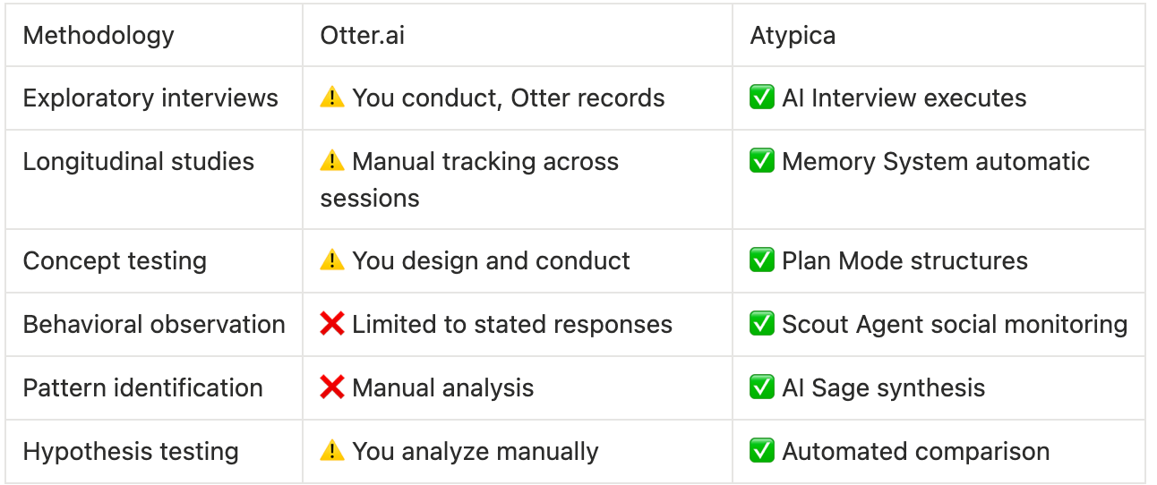 This creates a methodological gap: conversation documentation (Otter excels here) versus research execution (where structured investigation matters more than transcription accuracy). Otter wasn’t designed for the second scenario—and that’s where Atypica positions itself as a complementary research approach for teams needing both.