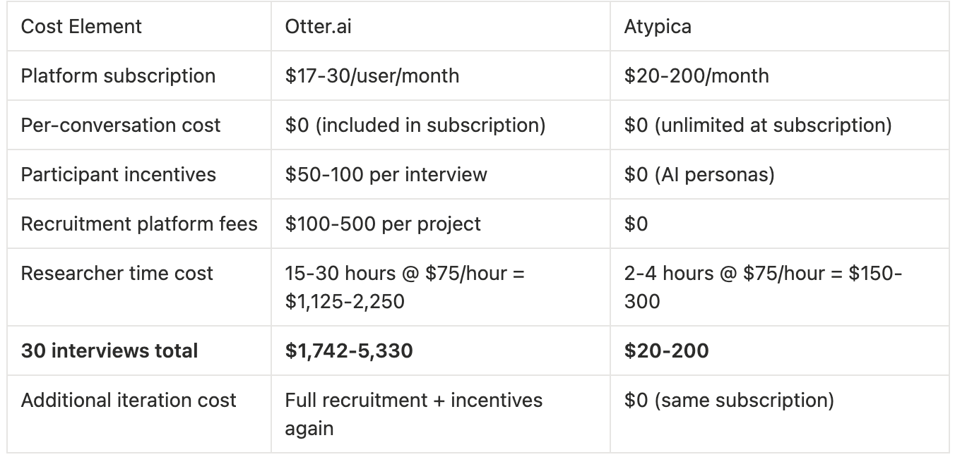 Break-even analysis: For teams running 2+ research projects per quarter, Atypica’s unlimited model becomes more economical than the full cost of human recruitment, incentives, and time investment.