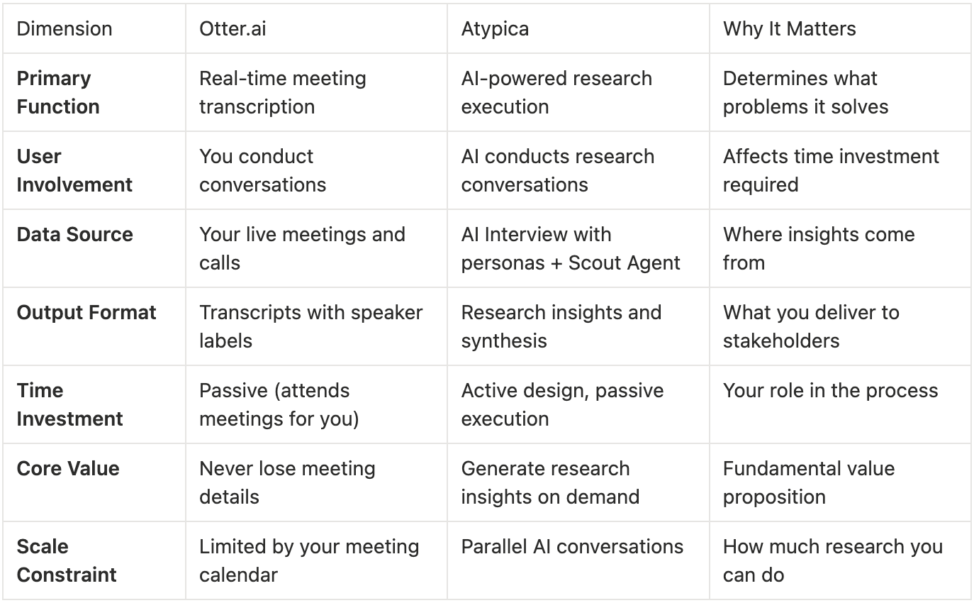 When product teams need insights from user conversations, two tools frequently come up: Otter.ai for transcription and Atypica for research. Yet comparing them reveals a fundamental category difference—one that matters more than feature lists.