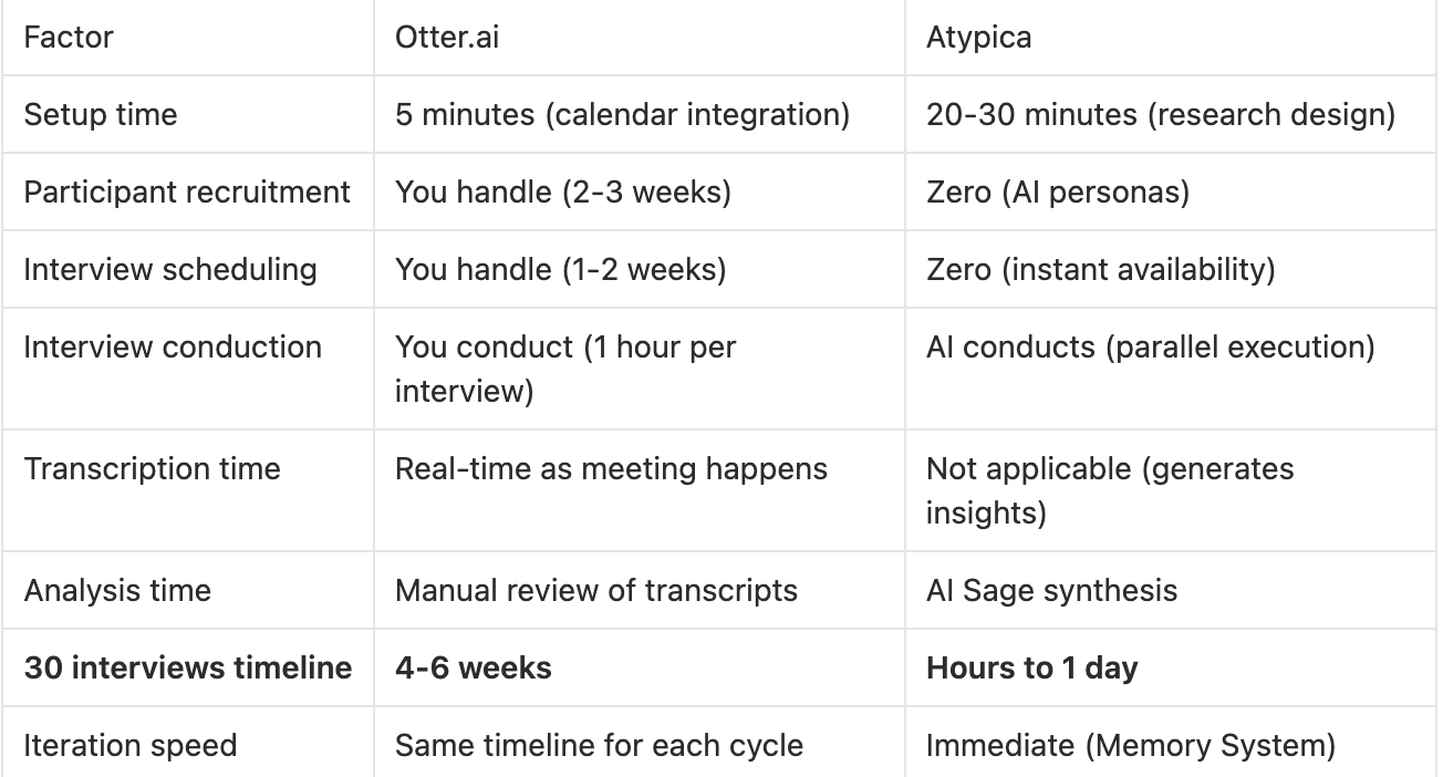 Real product team scenario: A PM needs to validate three feature concepts with 30 users. Otter can perfectly transcribe those 30 interviews—but the PM still needs to recruit 30 participants, schedule 30 separate meetings, conduct 30 interviews over 2-3 weeks, and manually analyze 15 hours of transcripts.