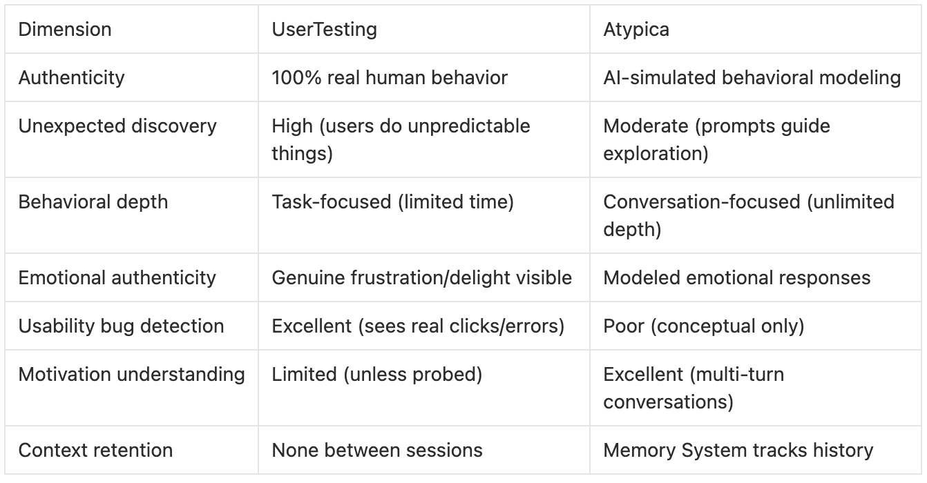 This creates a methodological gap: early-stage concept validation (before prototypes exist) versus execution validation (testing built products). UserTesting wasn’t designed for the first scenario—and that’s where Atypica positions itself as a complementary AI research accelerator for teams who need both speed and depth in early exploration.