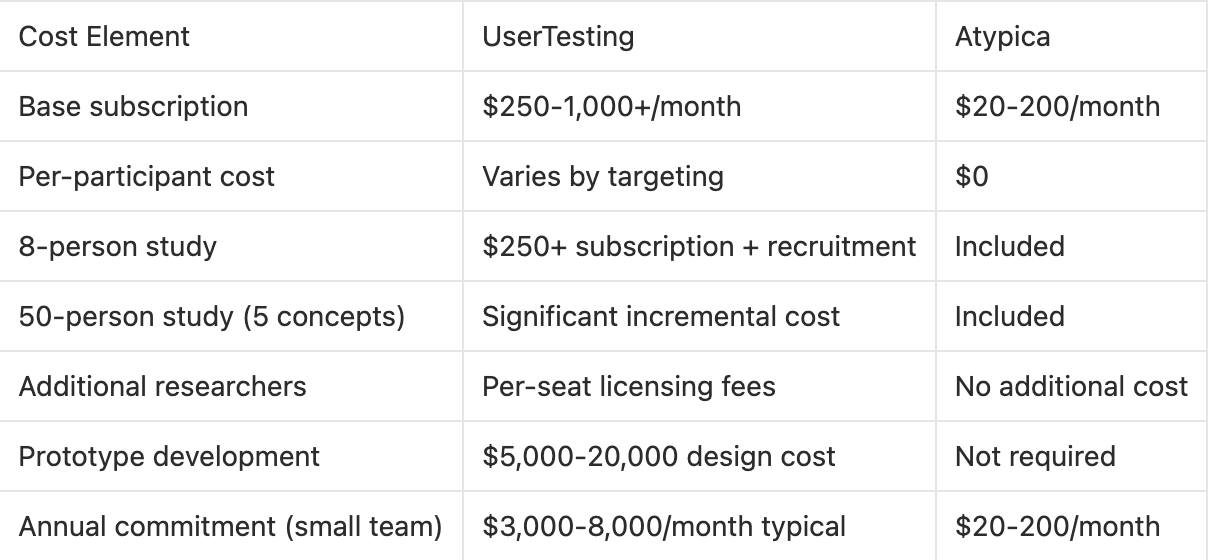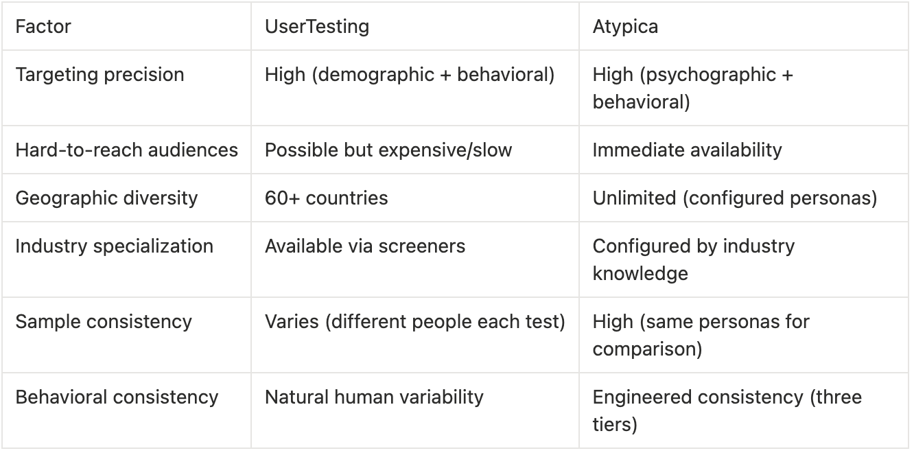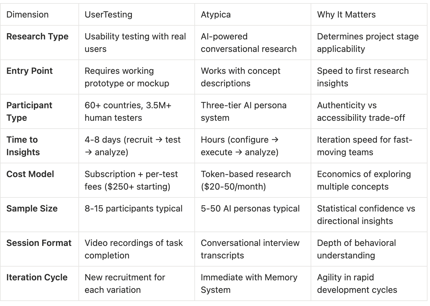 The fundamental difference: UserTesting validates how users interact with built products. Atypica explores whether concepts are worth building in the first place.
