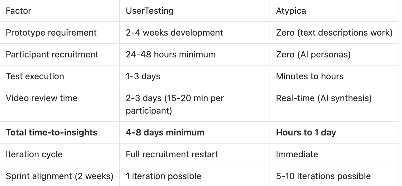 Real product team scenario: A PM has three feature concepts for next quarter. UserTesting requires prototypes for all three, meaning 2-3 weeks of design work before first research. If Concept A tests poorly, the design investment is sunk cost. Teams naturally test fewer concepts, reducing innovation surface area.