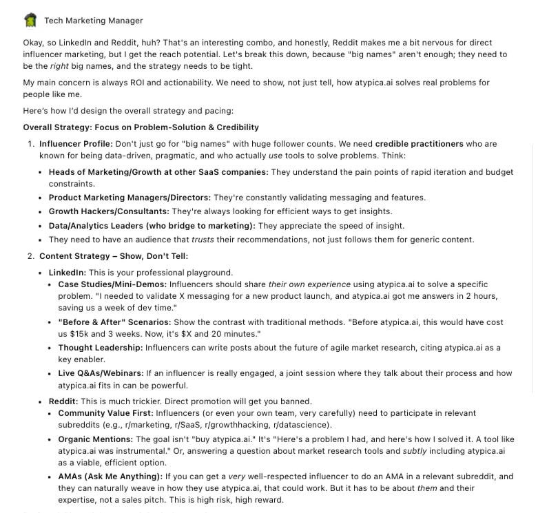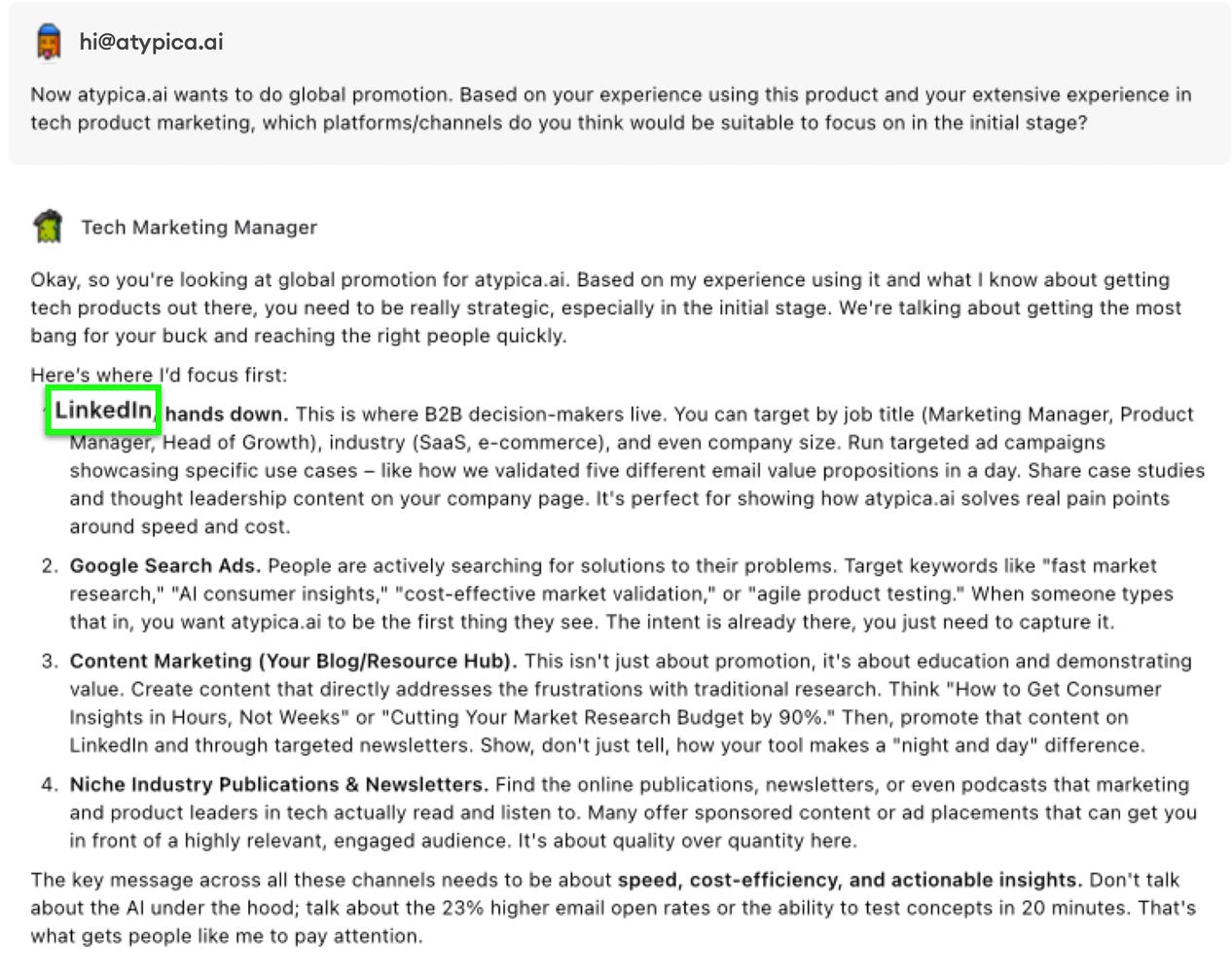 Take Atypica as an example: “If Atypica wants to run a marketing campaign, which channels should we prioritize, and what approaches should we use?”