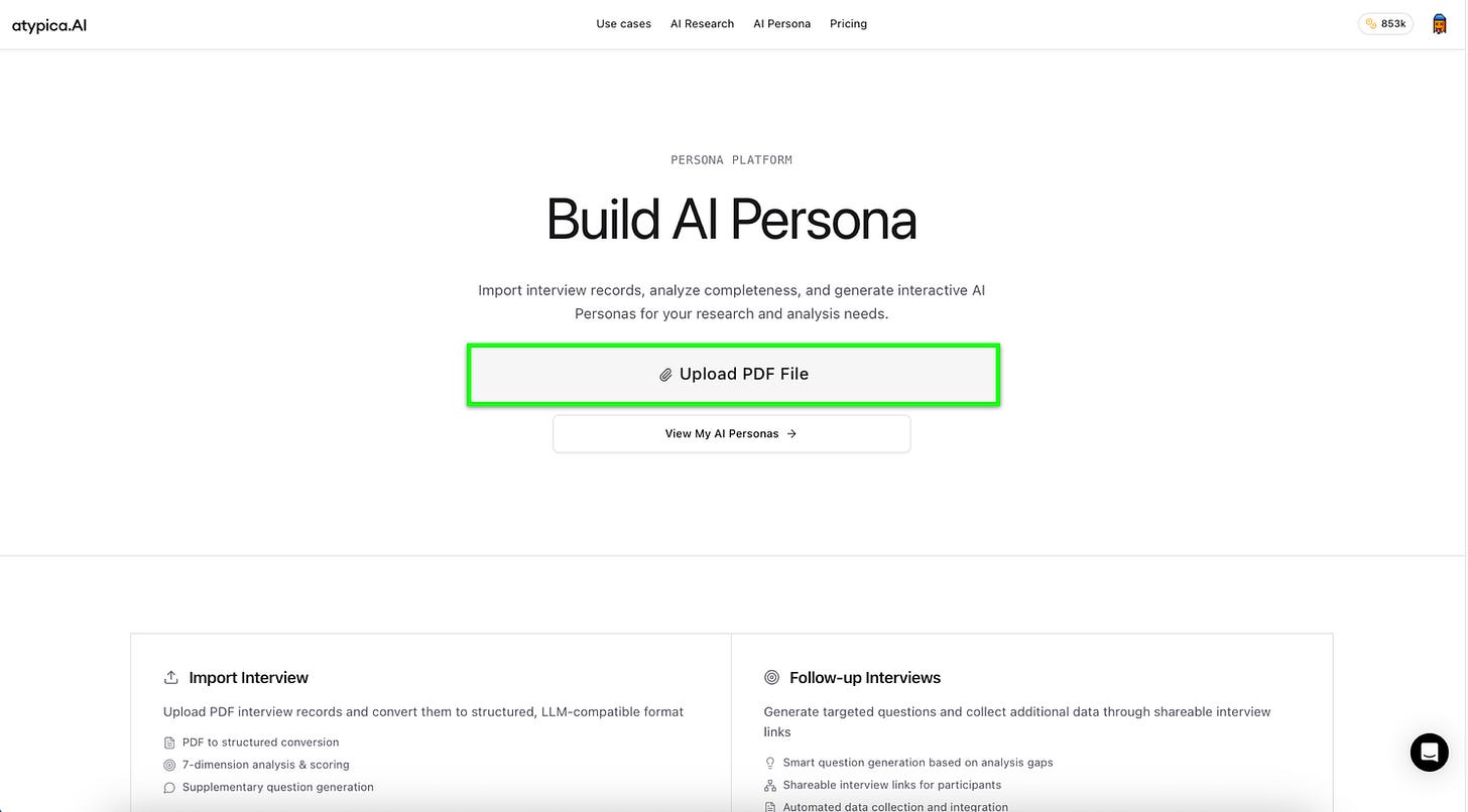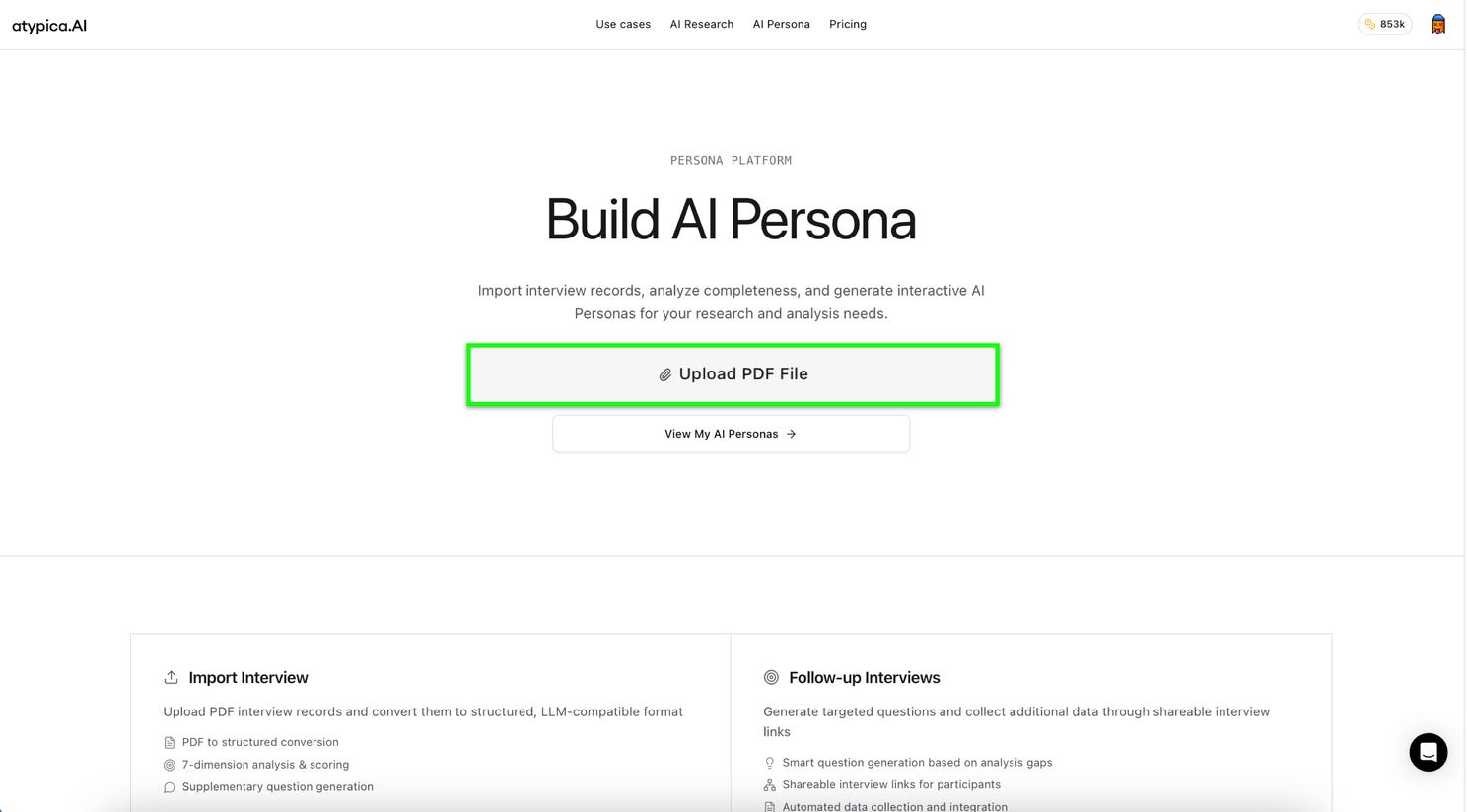 Import your existing user interviews, focus group transcripts, or meeting notes (PDF). The content serves as the crucial foundation for generating your proprietary "Human AI Persona" and is visible only to yourself.