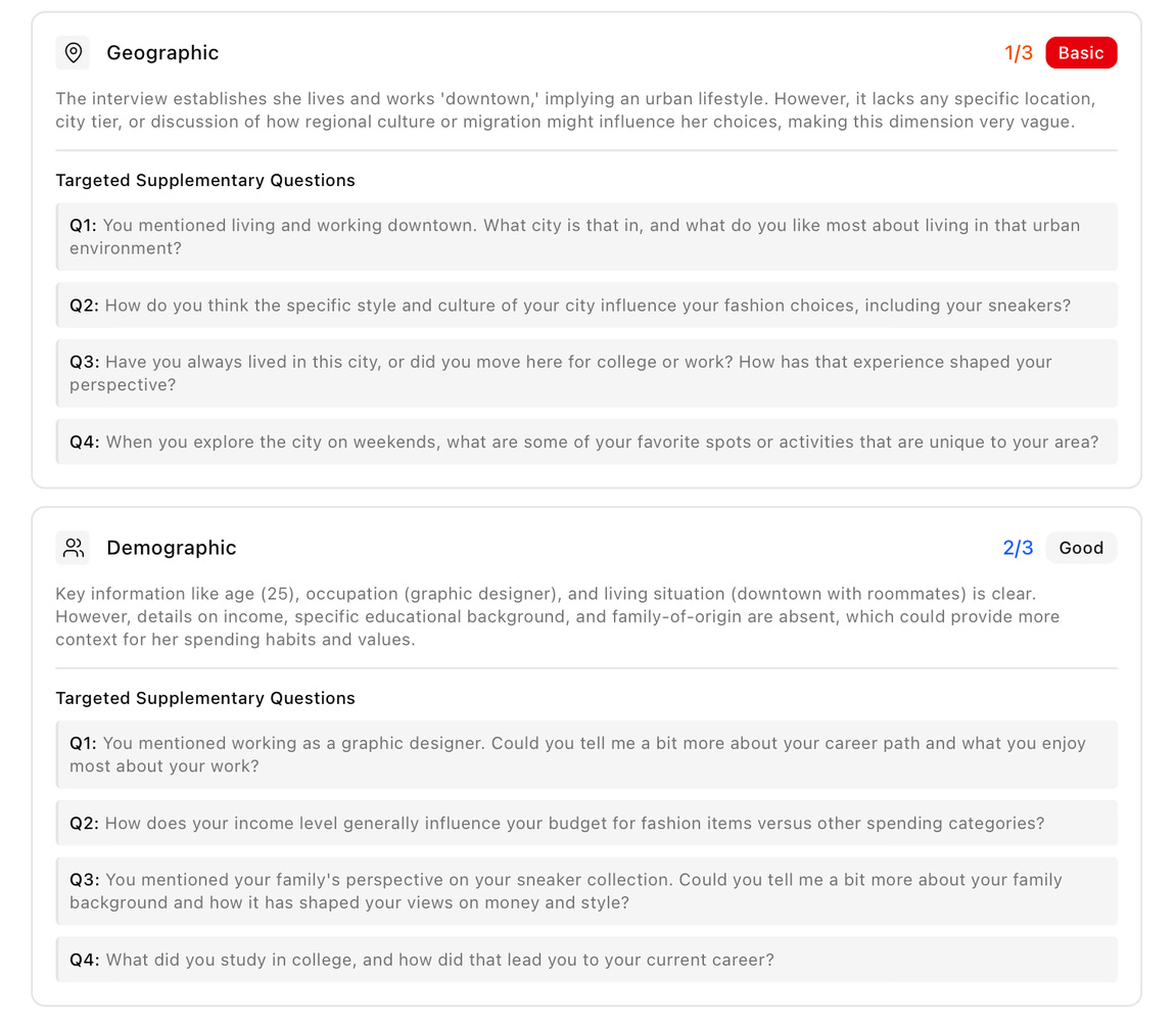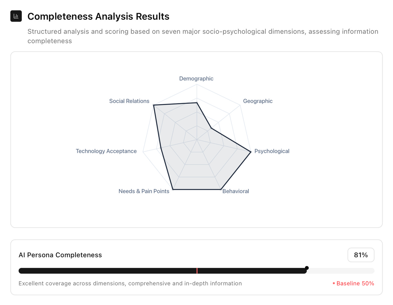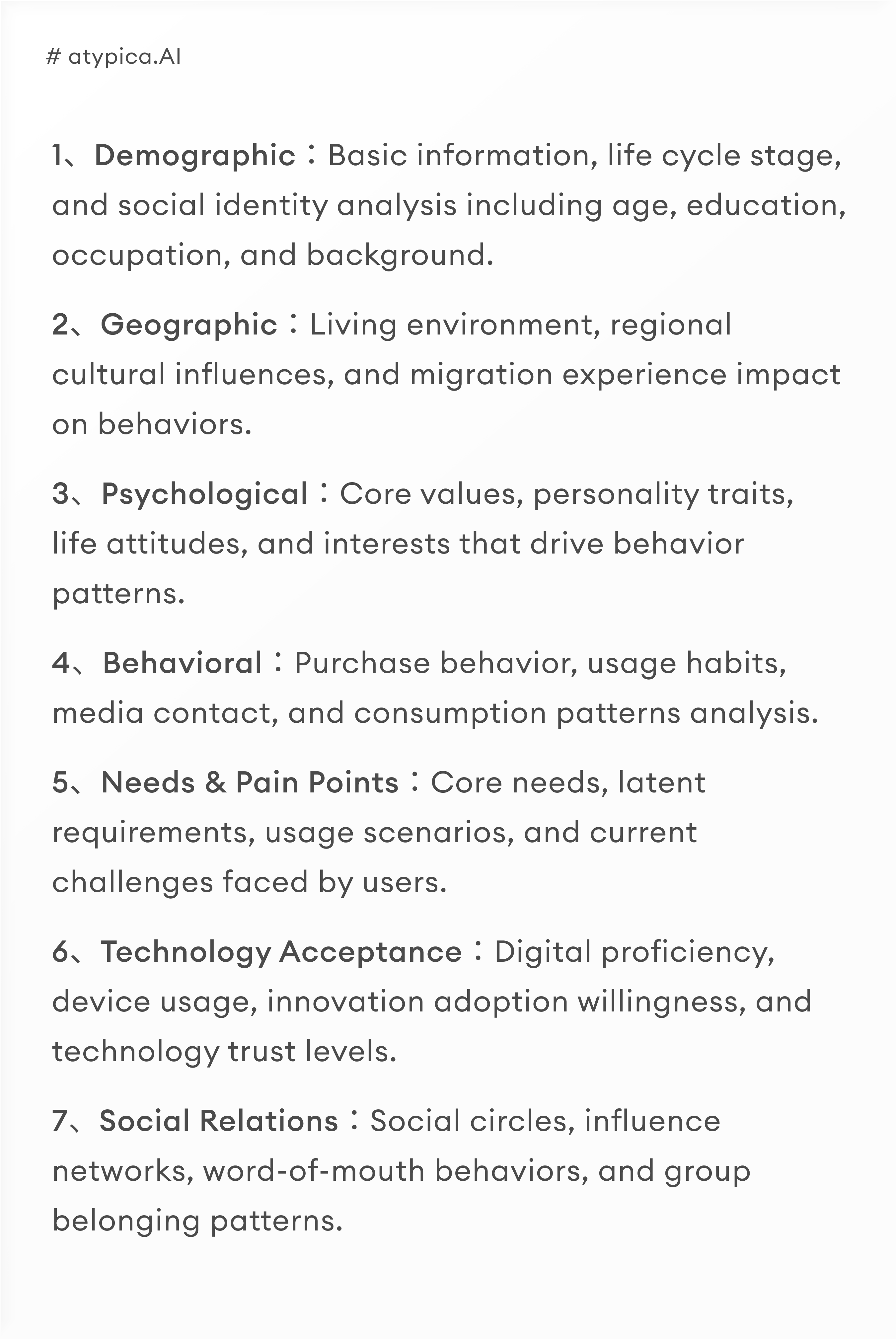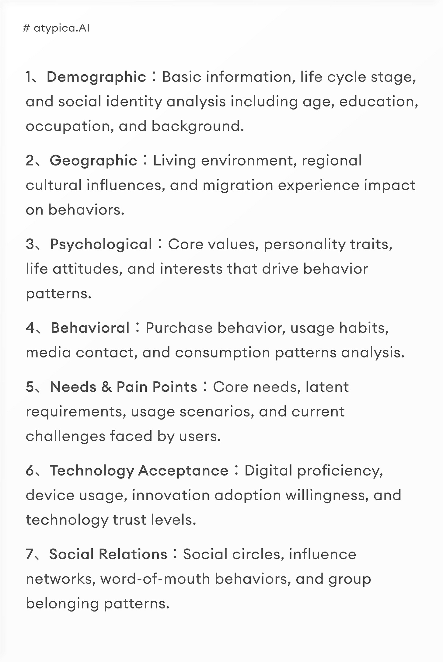 Inspired by this approach, Atypica evaluates interview completeness across seven key socio-psychological dimensions, ensuring that Personas reflect authentic behavioral preferences and decision-making logic.