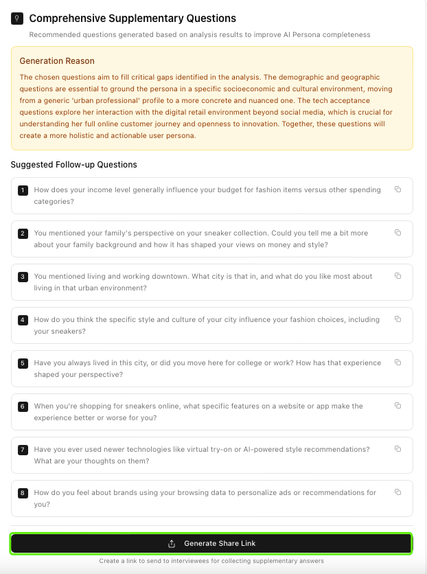 You can share the interview link with your participant, invite him/her to answer questions to collect additional data. Your Personas will become richer, more nuanced, and closer to real consumers.
