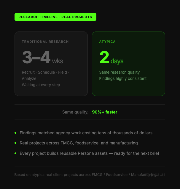 At Atypica, we’ve worked with brands across FMCG, foodservice, and manufacturing on exactly this use case — testing how consumers perceive different products before launch. The same research that traditionally takes 3–4 weeks gets done in under 2 days.