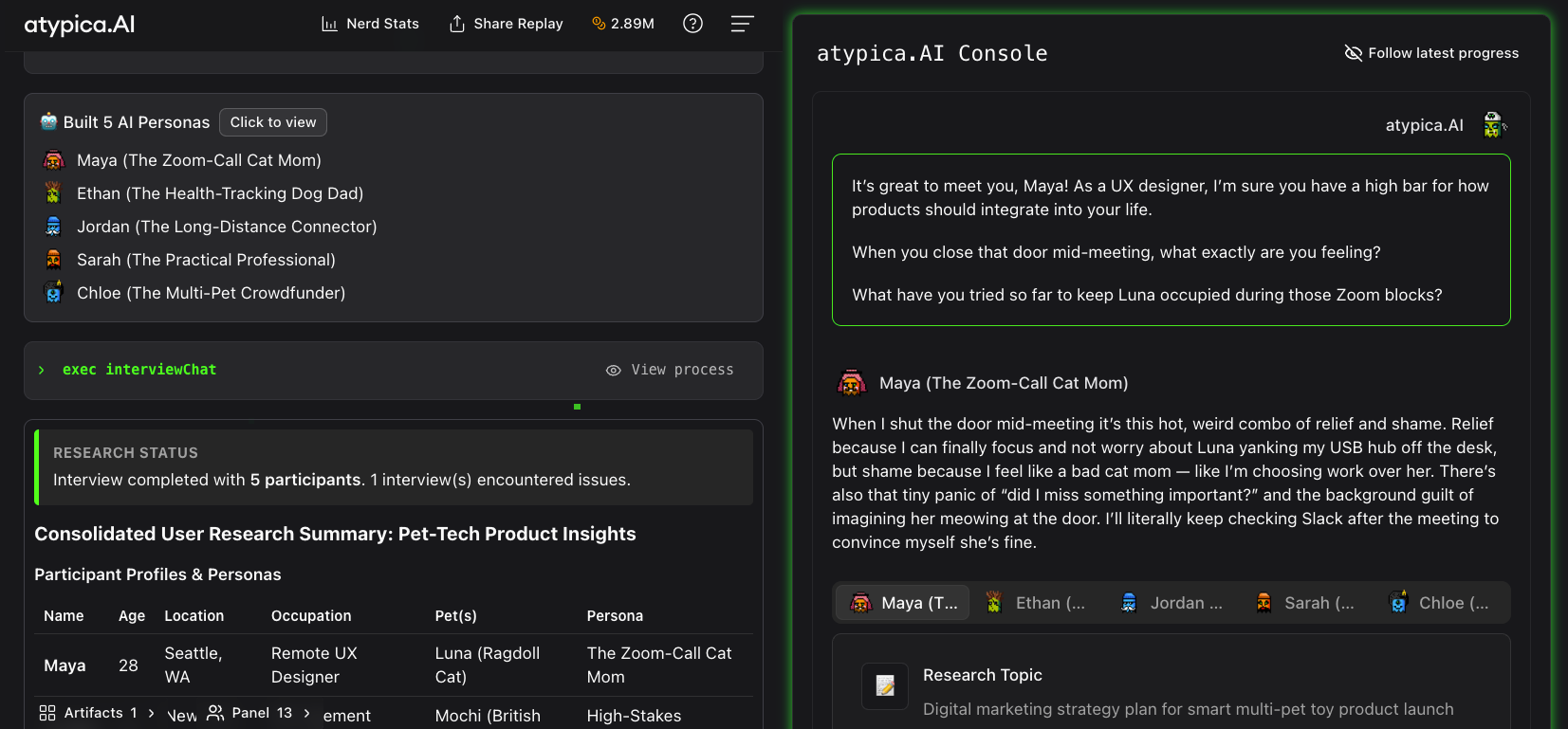 At Atypica, we’ve run large-scale consumer pain point research for clients in FMCG and pet industry— the kind of study where you need both breadth across segments and genuine depth within each one. In one project, we conducted what would have been equivalent to 40+ depth interviews across 5 consumer segments in under 3 days.