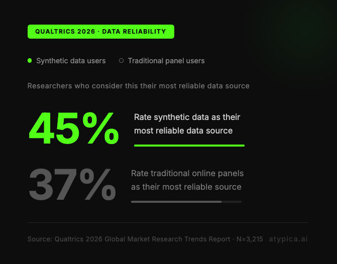 Among researchers who have adopted synthetic data, 45% now consider it their most reliable data source — ahead of traditional online panels at 37%.