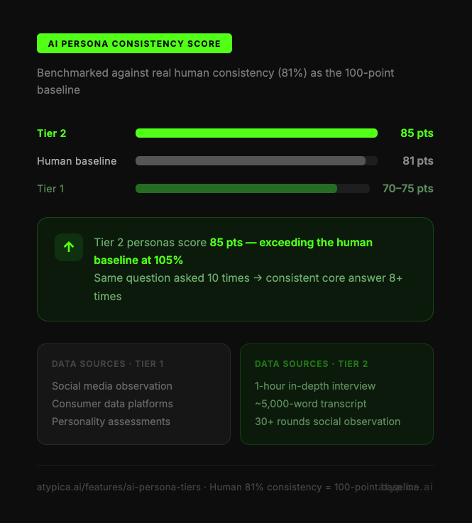 At Atypica, we do something rare in this industry: we benchmark AI Persona consistency against a real human baseline.