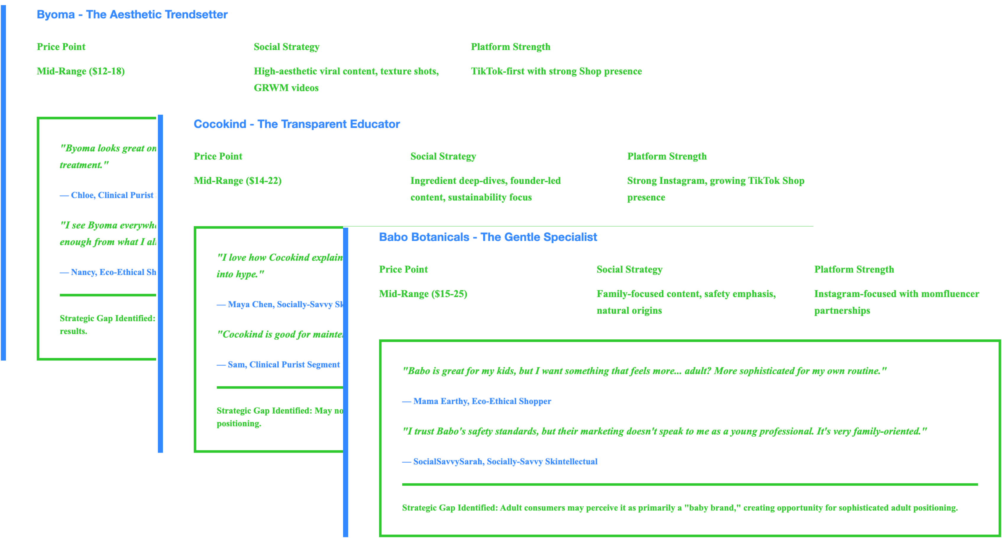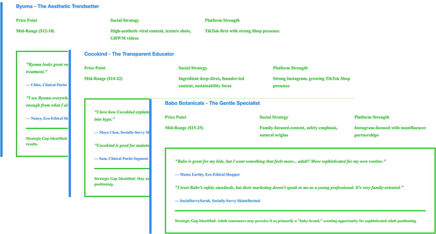 The research report gave Sophie a clear competitive map. It pinpointed three leading brands—Byoma, Cocokind, and Babo Botanicals—and highlighted each one’s price points, social strategy, and perception gaps.