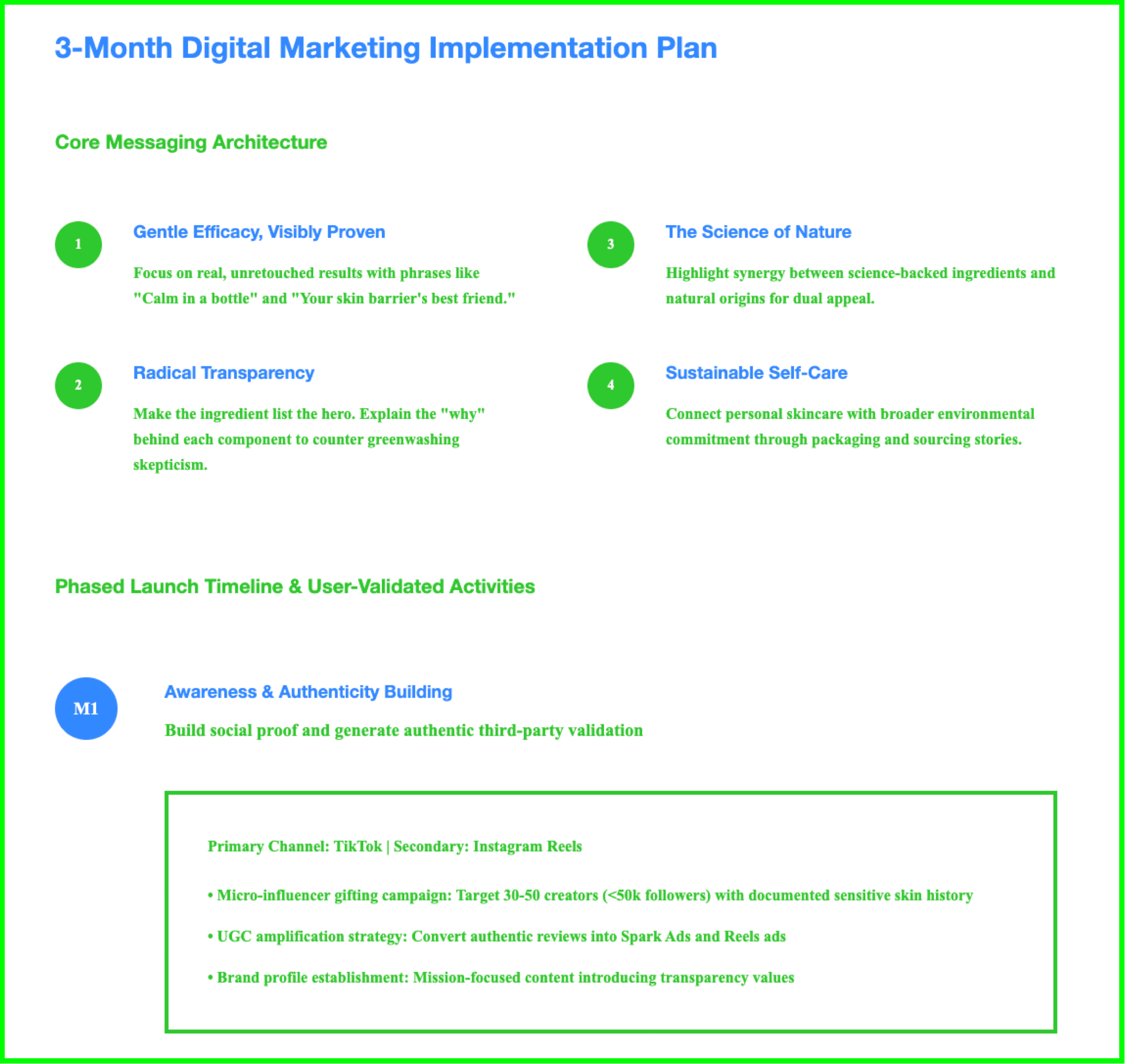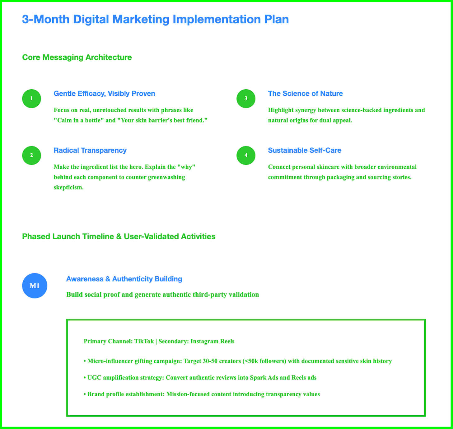 Month 1 (Authenticity): Micro-influencer gifting to 30–50 creators with sensitive skin history, plus TikTok-first content establishing radical transparency.