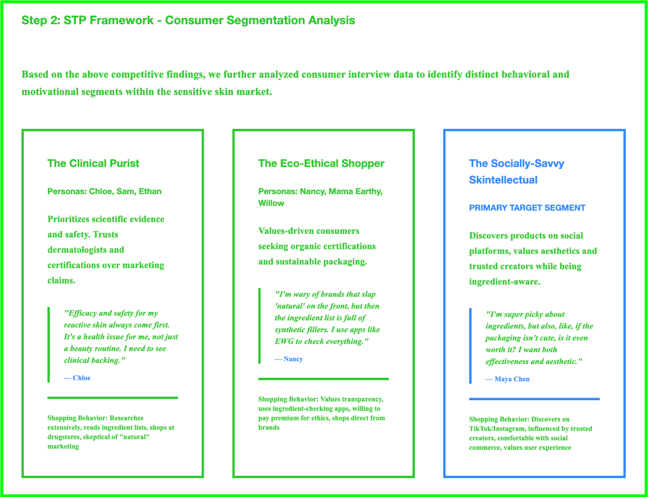 Within minutes, it scanned more than 15 competing brands on TikTok Shop and Instagram, reviewed social media analytics, and simulated eight in-depth consumer interviews across three key segments within the sensitive skin market:
